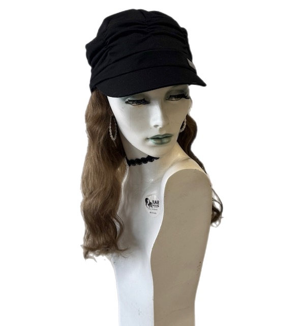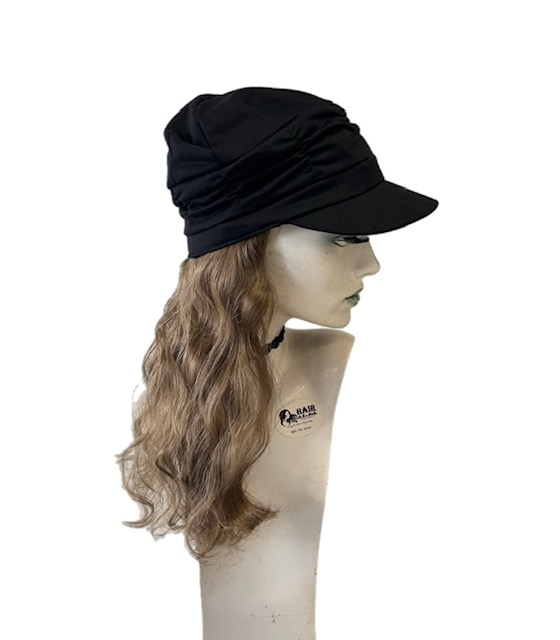 Synthetic hair attached to hat